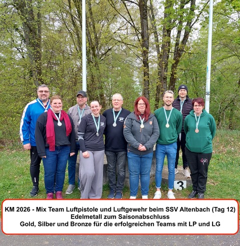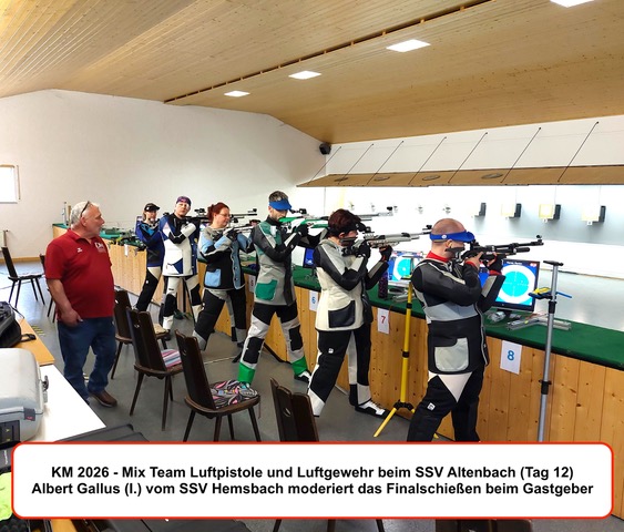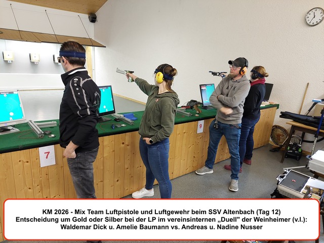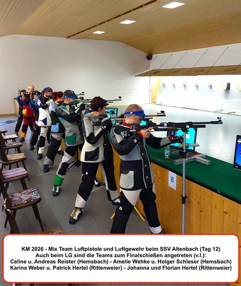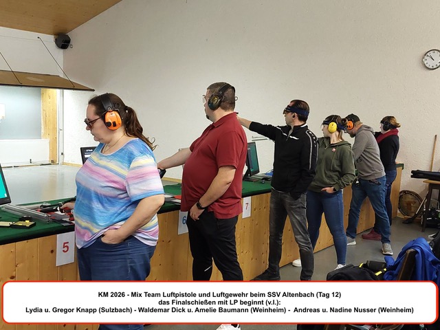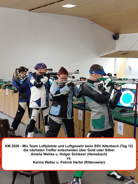 Der 12. und letzte Wettkampftag der Kreismeisterschaften 2026 bot noch einmal Spannung pur, denn auf dem Schlussprogramm in Altenbach stand das Schießen in den Mix – Team – Wettbewerben mit Luftgewehr und Luftpistole. Trotz kurzfristriger Ausfälle im Vorfeld waren insgesamt noch 7 Teams aus Weinheim, Rittenweier, Hemsbach und Sulzbach am Start. Im Pistolenwettkampf zeichnete sich früh ab, daß die Entscheidung um Gold und Silber zwischen den beiden Teams vom SSV Weinheim fallen würde und Bronze für den SSV Sulzbach bleibt. Bis zum Ende der 5 Schuss – Serien konnten die Weinheimer Titelverteidiger Amelie Baumann und Waldemar Dick ihre vereinsinternen Konkurrenten Nadine und Andreas Nusser mit 5,1 Ringen Differenz noch deutlich auf Abstand halten. Bei den Einzelschüssen schmolz aber der eigentlich komfortable Vorsprung nicht nur zunehmend dahin, sondern verwandelte sich kurzzeitig sogar in einen kritischen Rückstand. Erst mit dem allerletzten Wettkampfschuss ging das Erfolgs – Duo des Vorjahres wieder mit 1,4 Ringen in Führung und rettete damit seine Goldmedaille. Nervenkitzel war auch beim Luftgewehr garantiert. Hemsbach und Rittenweier hatten dort je 2 Teams ins Rennen geschickt. Nach Ausscheiden auf Platz 4 für Hemsbach und Bronze für Rittenweier blieben zum Showdown um die Goldmedaille Amelie Wehke mit Holger Schleser für den SSV Hemsbach gegen Karina Weber und Patrick Hertel vom SSV Rittenweier auf dem Stand. Bei den 5 Schuss – Serien und bis zum 21. Einzelschuss dominierten die Hemsbacher den Schlagabtausch erst mehr, dann weniger. Der Abstand zu den Rittenweierer Gegnern reduzierte sich auf hauchdünne 0,5 Ringe. Das Blatt konnte sich also noch wenden, entscheidend würden die letzten 3 Treffer sein. Klarheit schuf auch hier erst der 24. Wettkampfschuss. Weber und Hertel lieferten zum Abschluss des Finales eine 10,5 und 10,4. Mit der unglücklich platzierten 7,0 von Wehke und einer 9,4 von Schleser landeten die Hemsbacher bei einem Rückstand von 2,1 Ringen schließlich auf dem 2. Platz. Die Goldmedaille ging an den SSV Rittenweier.